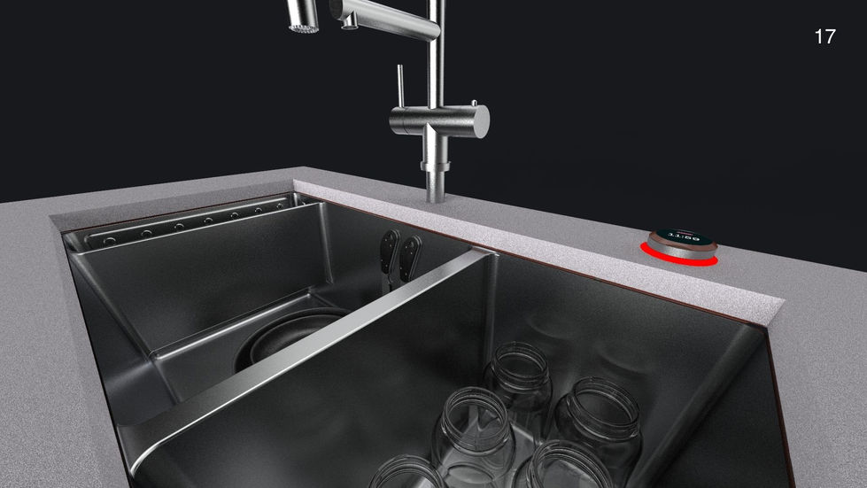 The sink for "crunchy moms." A sink that maximizes productivity and enhances the user journey experience of someone that is in the kitchen a lot, cooking with fresh produce from the garden and often preserves food for the family.
